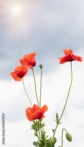 © yelantsevv, Obraz premium Czerwone maki w świetle poranka. Pole maków