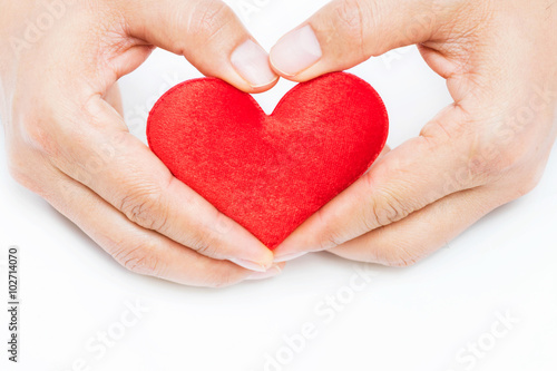 © mydegage, Obraz premium Czerwone serce w ręce na białym tle.