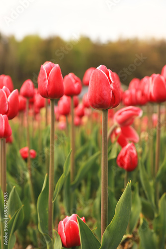 Obraz premium Czerwone tulipany, wiosenne kwiaty. Pole tulipanów