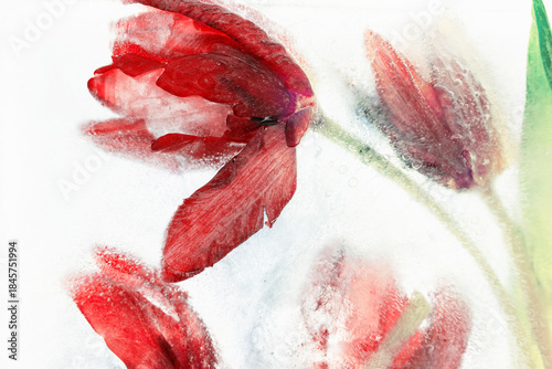 Naklejka premium Czerwone tulipany zamrożone w lodzie, przedstawione w malarskim, artystycznym...