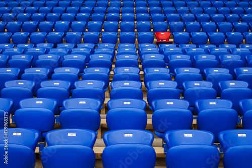 Naklejka premium Czerwony fotel w rzędzie niebieskich foteli. Być innym. Bądź wyjątkowy.