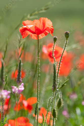 © Franz, Obraz premium Czerwony mak przed niewyraźną łąką