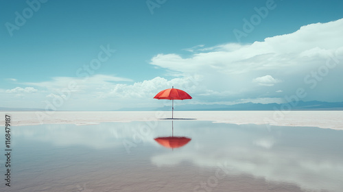 Fototapeta premium Czerwony parasol na tle nieskończonego solniska, z jego wyrazistym odbiciem w...