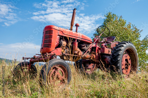 © mbruxelle, Fototapeta premium czerwony stary zardzewiały traktor w polu