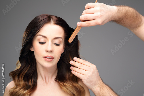 © Robert Przybysz, Fototapeta premium Czesanie włosów. Piękna kobieta w fryzjera