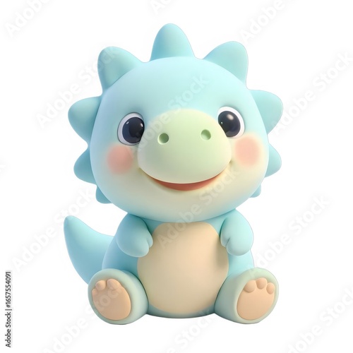 Obraz premium 愛らしい青い恐竜キャラクターが白背景に座り幸せそうな笑顔で表現された3Dイラスト