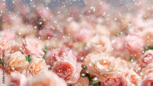 Fototapeta premium 柔らかい光に包まれたピンクとピーチ色のバラの花園に舞い落ちる白い雪のような粒子の幻想的な風景の3Dレンダリング