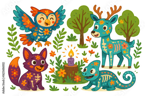 © NoblePix, Fototapeta premium Día de Muertos Joyful Alebrije Animal Spirit Guides Coloring Illustration, Flat Vector