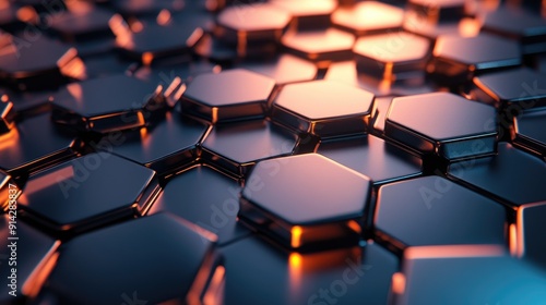 © pinporn manosri, Obraz premium 3D abstract background with interlocking hexagonal patterns and metallic textures