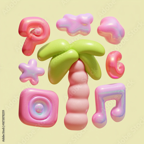 © namdarcreative, Naklejka premium 3D Abstract Palm Tree with Music Notes and Speaker on green background