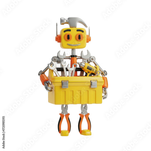 Fototapeta premium 3d adorable cartoon robot holding a yellow toolbox filled with tools...