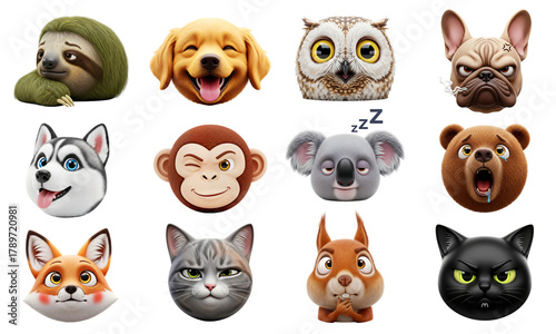 © Das, Naklejka premium 3D animal emoji icon set. Collection of cute cartoon animal faces and characters with various emotions, isolated on a transparent background. png