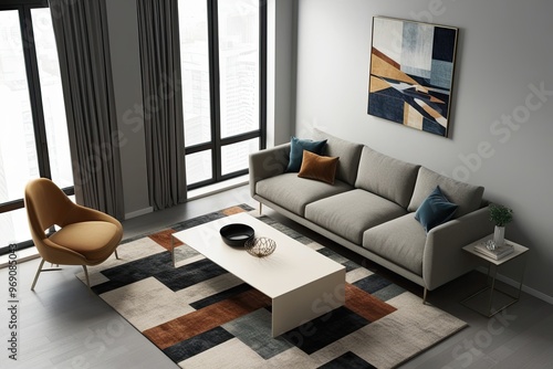© Michael, Fototapeta premium 3D Artwork of a Modern Apartment Living Room with a Fabric Sofa, Minimalist Coffee Table, and Geometric Area Rug in an Elevated View