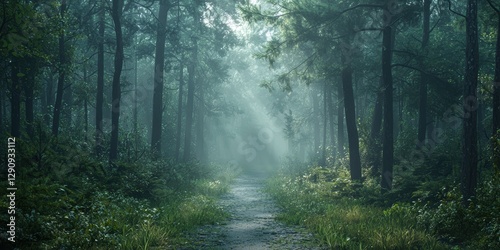 © Антон Федченко, Fototapeta premium 3d background minimalistic mockup with space for text, deep forest path surrounded by tall trees with misty light filtering through