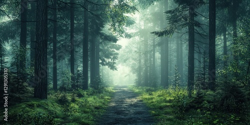 © Svitlana, Fototapeta premium 3d background minimalistic mockup with space for text, deep forest path surrounded by tall trees with misty light filtering through