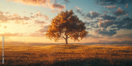 © Sergey Fedchenko, Fototapeta premium 3d background minimalistic mockup with space for text, dramatic shot of a single oak tree standing tall in an open golden field at sunset