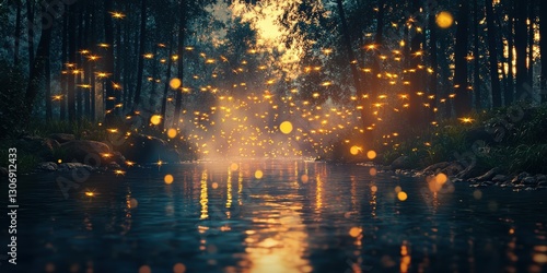 © Marina, Naklejka premium 3d background minimalistic mockup with space for text, surreal glowing fireflies hovering above a calm forest river at dusk