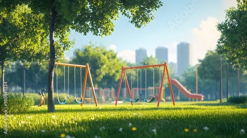© Apiwat, Fototapeta premium 2D background of a playground with swings, slides, and a grassy field, creating a cheerful atmosphere, hyper-realistic, sharp images, high quality