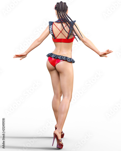 © vladnikon, Fototapeta premium 3D Beautiful sexy brunette girl red black latex corset.Minimalist extravagant clothes future.Woman studio photography.High heel.Conceptual fashion art.Burlesque show.Render illustration.Maid uniform