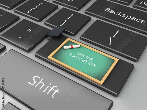 © Mego-studio, Fototapeta premium 3d Blackboard, graduation cap on computer keyboard.