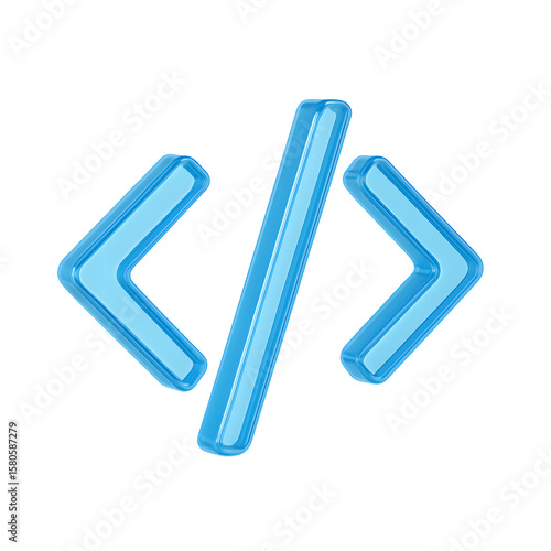 Obraz premium 3D blue code symbol icon with glossy translucent angle brackets, isolated on...