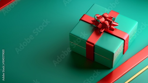 © Tackey, Obraz premium 3D Bright Green Gift Box with Red Ribbon and Bow. Christmas Theme.
