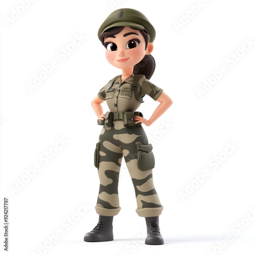 Fototapeta premium 3D cartoon, a female soldier in camouflage uniform profession. on a solid white background