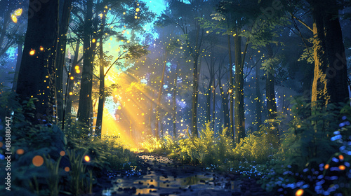 © febrinadwsr, Naklejka premium 3D cartoon in the forest with a star twinkle background. wallpaper cartoon in the forest