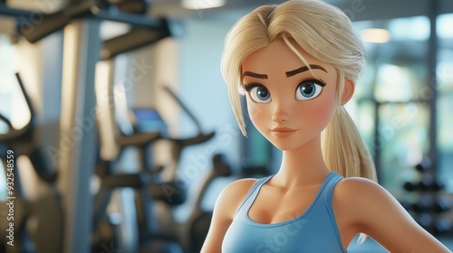 Obraz premium 3D cartoon of a focused young blonde woman exercising in a gym Slim sporty...