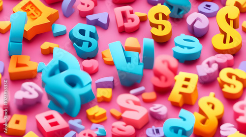 © GG Kenji, Obraz premium 3D Cartoon Seamless Tile Pattern with Animated Currency Symbols and Discount Signs for Dynamic Business Advertising Backgrounds