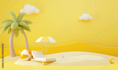 Obraz premium 3d cartoon simple minimalistic illustration of beach with sand, yellow background, beach ball and palm tree, white color sunbed, one small flower on the side, sun umbrella, yellow clouds, minimalism