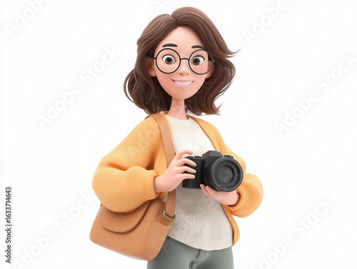 © Arcner, Obraz premium 3D Cartoon Woman Holding DSLR Camera and Lens Bag, Ready-to-Shoot Pose Isolated on White Background, Stylized Render