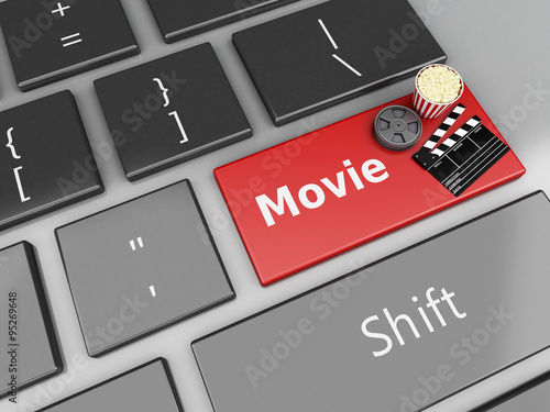 © Mego-studio, Naklejka premium 3d Cinema Clapper board, popcorn and Film reel on computer keybo