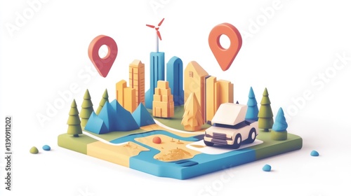 © AdhiWilly Creative, Obraz premium 3D City Map with Vehicle, Location Markers