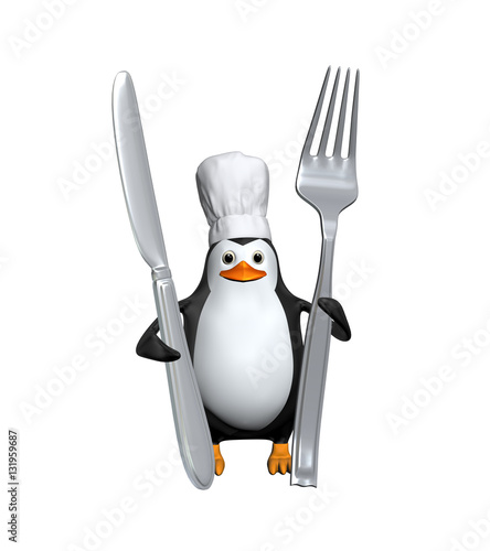 © asfianasir, Fototapeta premium 3d cooker penguin holding knife and fork