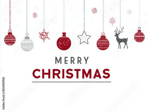 © Noble Nature, Naklejka premium Décor de boules de noël suspendues avec renne étoile et flocons sur fond blanc avec texte en anglais “MERRY CHRISTMAS” pour visuels saisonniers noël et fêtes de fin d’année