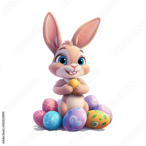 © Fuad Kajol's Gallery, Fototapeta premium 3D Cute Bunny Holding Easter Egg with Painted Eggs