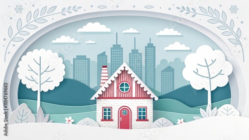 Naklejka premium 3d cute house papercut art illustration with city scape background