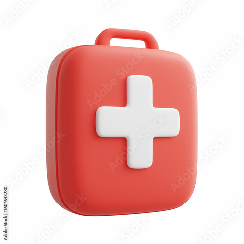 Fototapeta premium 3D cute red first aid kit with white cross, cartoon chubby style, isolated on...