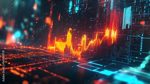 Fototapeta premium 3D data analysis process with abstract charts and graphs, floating geometric shapes with sharp, vibrant lighting, dark background creating depth, high-tech and dynamic mood