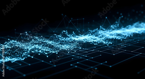 © Suhartini, Obraz premium 3D data visualization with flowing digital network connecting points, perfect for tech concepts. Wave technology