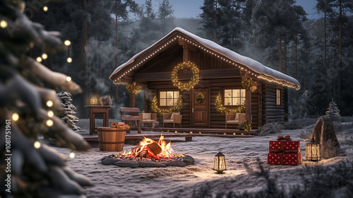 © iPhoto, Obraz premium 3D Decorated house with fireplace and christmas tree, Christmas celebration background illustration.