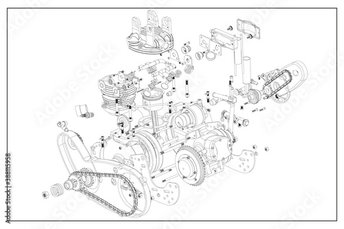 Obraz premium 3D design of a motorcycle engine with exploded view.