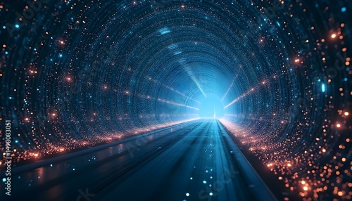 © Ai Technology, Obraz premium 3D digital mesh tunnels with pulsating light nodes and deep perspective .