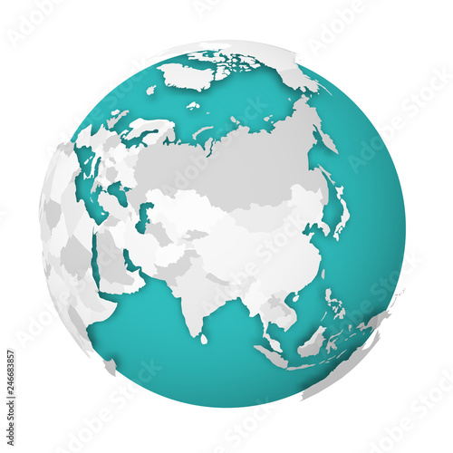 © pyty, Naklejka premium 3D Earth globe with blank political map dropping shadow on blue green seas and oceans. Vector illustration