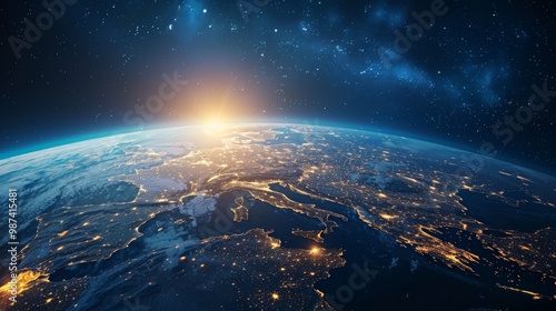 © Niphaphan, Fototapeta premium 3D Earth with atmospheric clouds and night lights in European regions