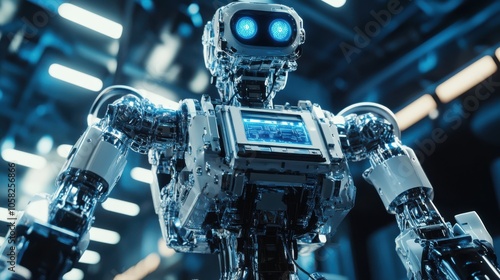 © Chatchanan, Fototapeta premium 3D effect of a sophisticated robot with a metallic frame and dynamic illumination, performing