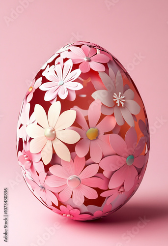 © Aisyaqilumar, Fototapeta premium 3D egg with cut-out flowers inside. Isolated on a pink background.
