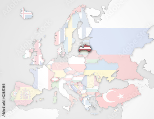 Fototapeta premium 3D Europakarte auf der Lettland hervorgehoben wird und die restlichen Flaggen...