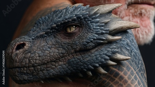 Obraz premium 3D fantasy dragon tattoo bursting from shoulder in surreal illusion